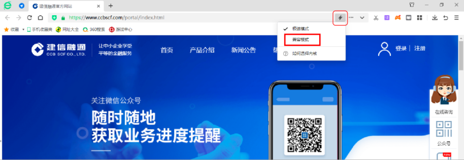 注册时需要使用安装win7及以上操作系统的电脑(鼠标右键点击【计算机】--【属性】进行操作系统版本查询),同时需在IE11浏览器或360安全浏览器的IE11内核兼容模式进行注册操作。对于360浏览器的模式更换,您可在浏览器上方的地址栏后面找到闪电标识,点击并更换兼容模式。如下图: