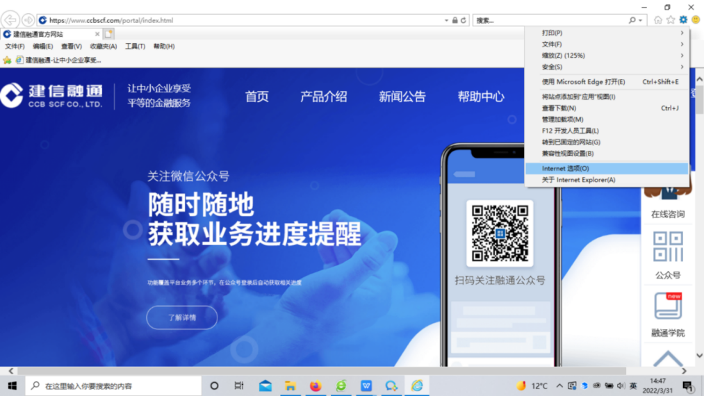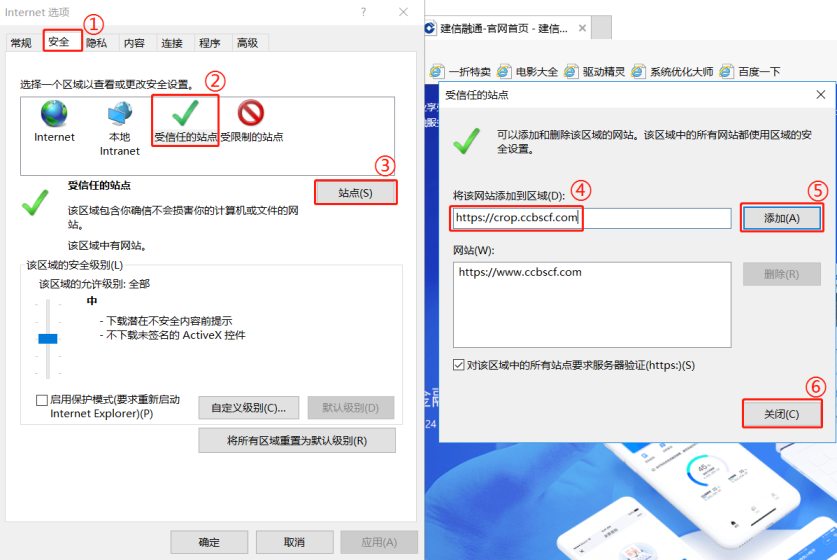 操作步骤:点击右上角小齿轮→点击【Internet选项】→点击【安全】→点击【受信任的站点】→点击【站点】→方框里输入或反显【https://corp.ccbscf.com】或【https://*.ccbscf.com】→点击【添加】→点击【关闭】→点击【确定】。
